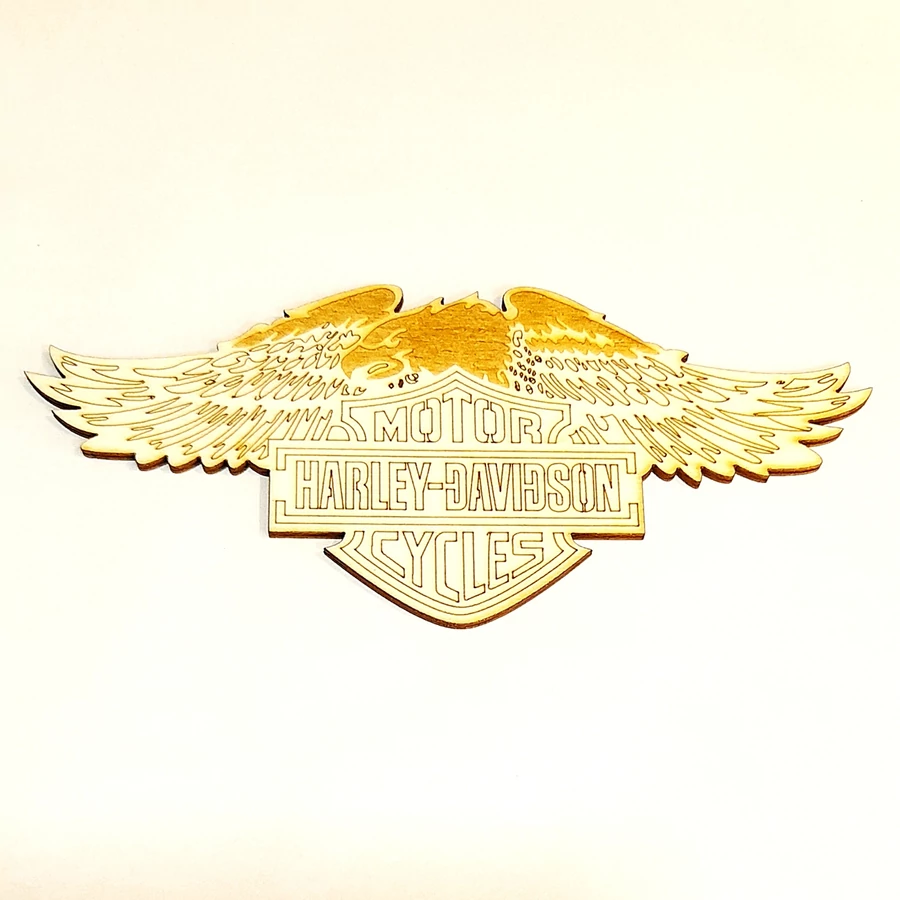 Lézervágott, natúr fa Harley Davidson felirat sas motívummal.