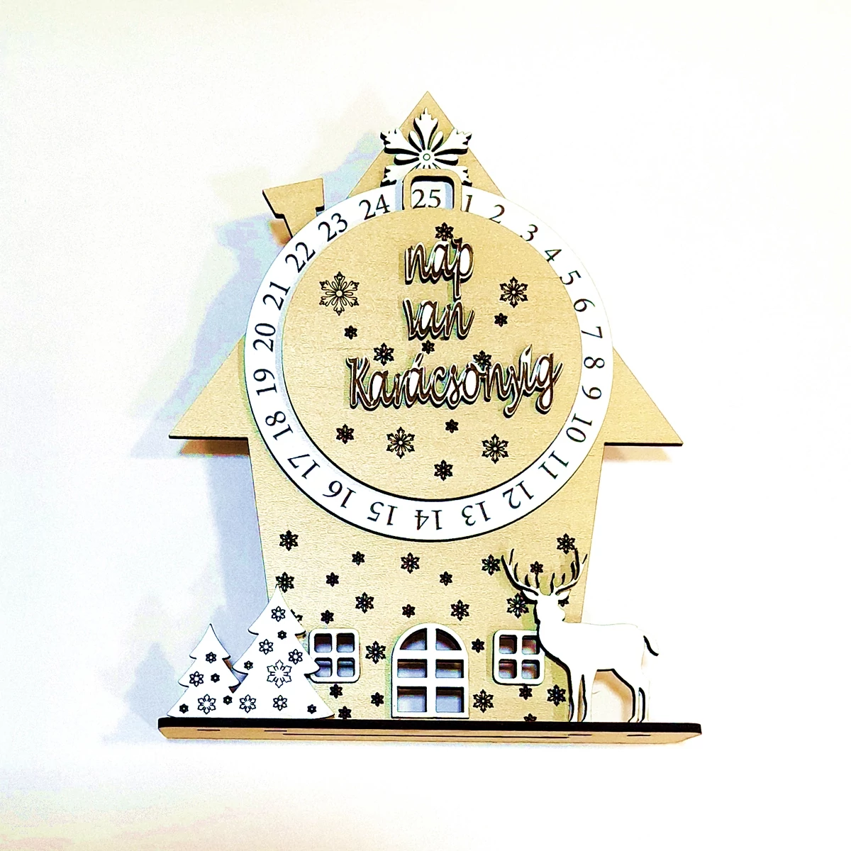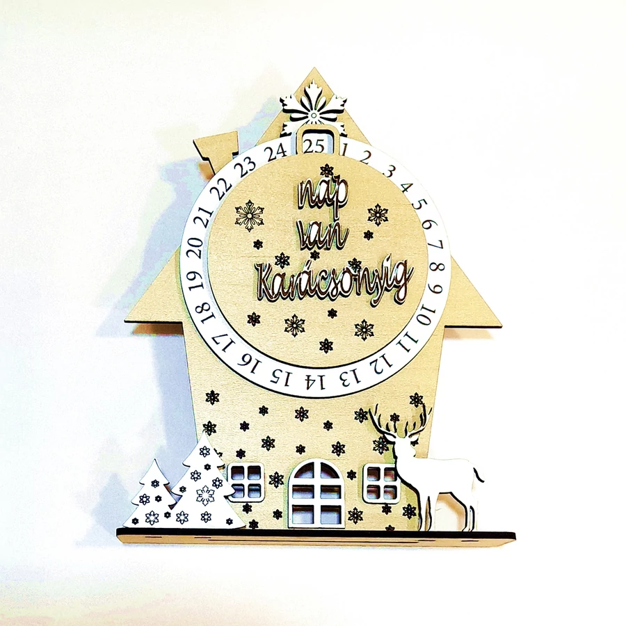 Ez a házikó alakú adventi naptár tökéletes karácsonyváró dekoráció lehet otthonába. Az adventi naptár HDF anyagból készült, szarvassal és fenyőkkel díszítve, mérete 16,5x21,5 cm, így könnyen elhelyezhető bármilyen helyiségben. A naptár festhető, így saját ízlésére szabhatja a megjelenését, de igy natúron is tökéletes. A termék cikkszáma: K736.