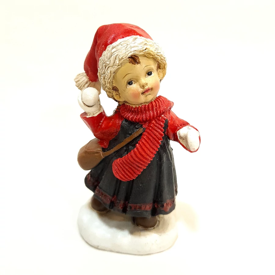 Bájos polyresin hógolyózó kislány figura, varázslatos kiegészítője téli faludnak, de akár így önmagában is tökéletes dekorációja otthonodnak.