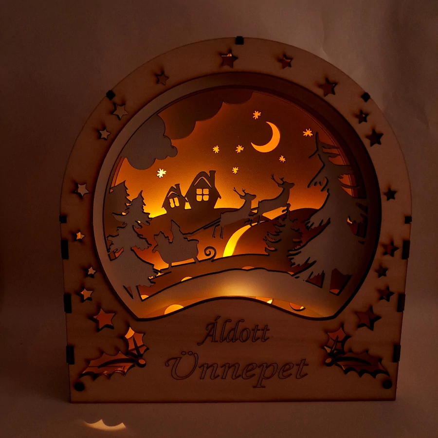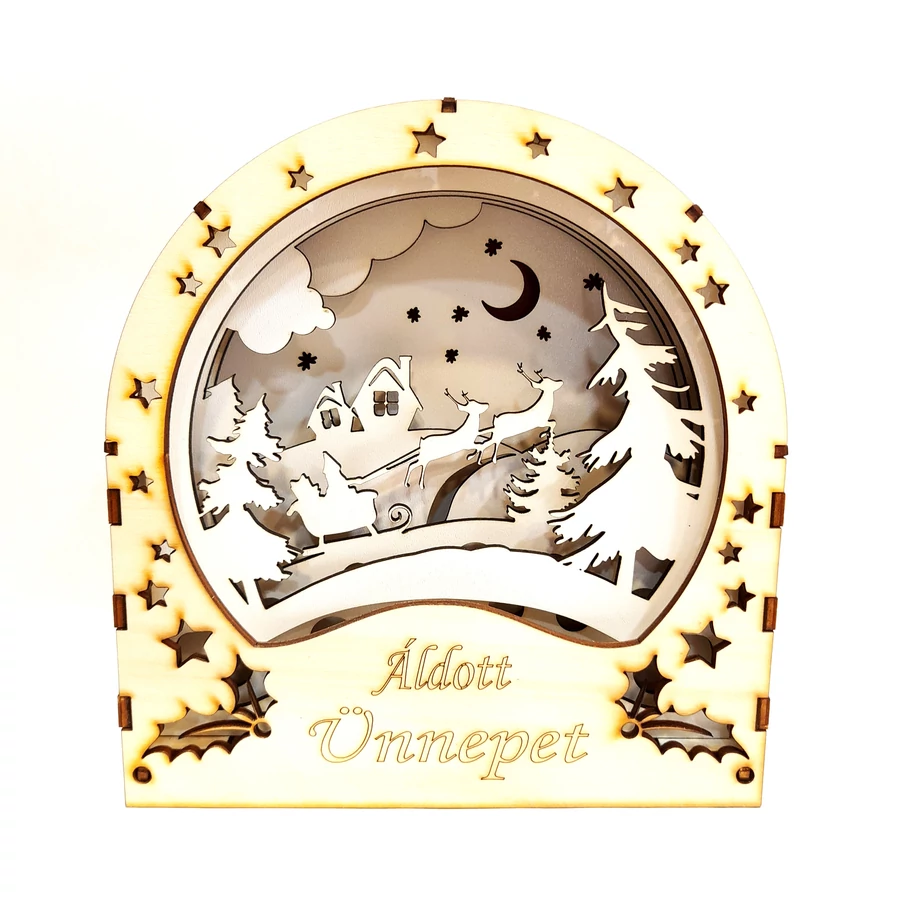 A K647 termékcikkszámú hógömb formájú natúr fa téli táj egyedi és hangulatos dekoráció a lakásodba. A lézervágott natúr fából készült hógömb 3D-s hatást kelt, ahol a Mikulás rénszarvasok húzta szánkója látható. A termék mérete 17x18x7 cm, és a rétegek közé ledszál is fűzhető, így igazán hangulatossá teheted a téli dekorációt. A termék tökéletes díszítés a karácsonyi időszakra, és egyedi hangulatot varázsolhat a lakásba.