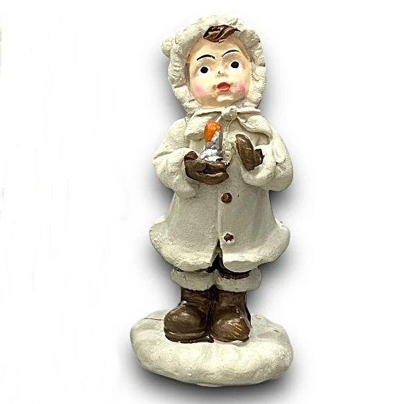 Bájos karácsonyi polyresin gyerekfigura, kedves kiegészítője karácsonyi faludnak, asztaldíszednek, de önmagában is tökéletes téli-karácsonyi dekoráció.