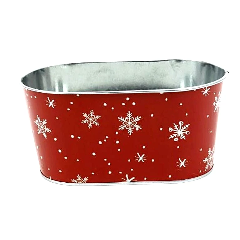 Karácsonyi fém kosár, piros alapon fehér hópelyhes. Mérete: 19,5x11x9,5 cm