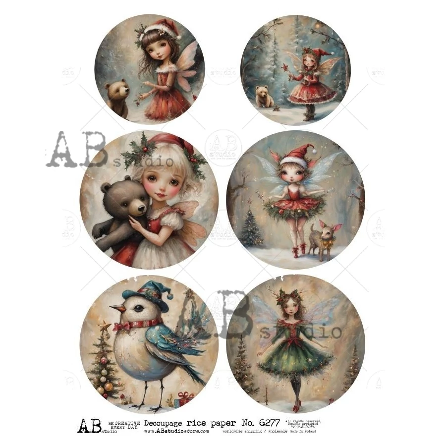 Rizspapir - 6 kép, karácsonyi tündér. A rizspapír egy könnyű, 30-35 gr-os papír, amely vékony szálakat tartalmaz. Bármilyen felületen használható dekupázs (decoupage) technikához a fától a vászonig, üvegig, fémig és akár textilre is! Tökéletes választás mixmédiás projektekhez. Ezeket a papírokat egész lapként vagy darabonként is használhatjuk.