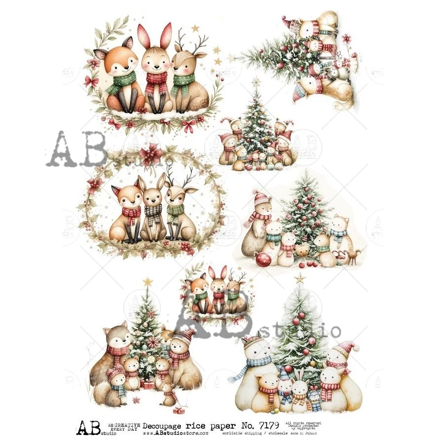 Rizspapir - aranyos állatok fenyőfával. A rizspapír egy könnyű, 30-35 gr-os papír, amely vékony szálakat tartalmaz. Bármilyen felületen használható dekupázs (decoupage) technikához a fától a vászonig, üvegig, fémig és akár textilre is! Tökéletes választás mixmédiás projektekhez. Ezeket a papírokat egész lapként vagy darabonként is használhatjuk.