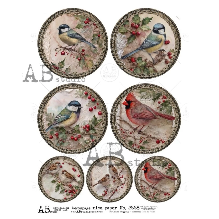 Rizspapir - cinkék és kardinális pintyek kerek képekben. A rizspapír egy könnyű, 30-35 gr-os papír, amely vékony szálakat tartalmaz. Bármilyen felületen használható dekupázs (decoupage) technikához a fától a vászonig, üvegig, fémig és akár textilre is! Tökéletes választás mixmédiás projektekhez. Ezeket a papírokat egész lapként vagy darabonként is használhatjuk.