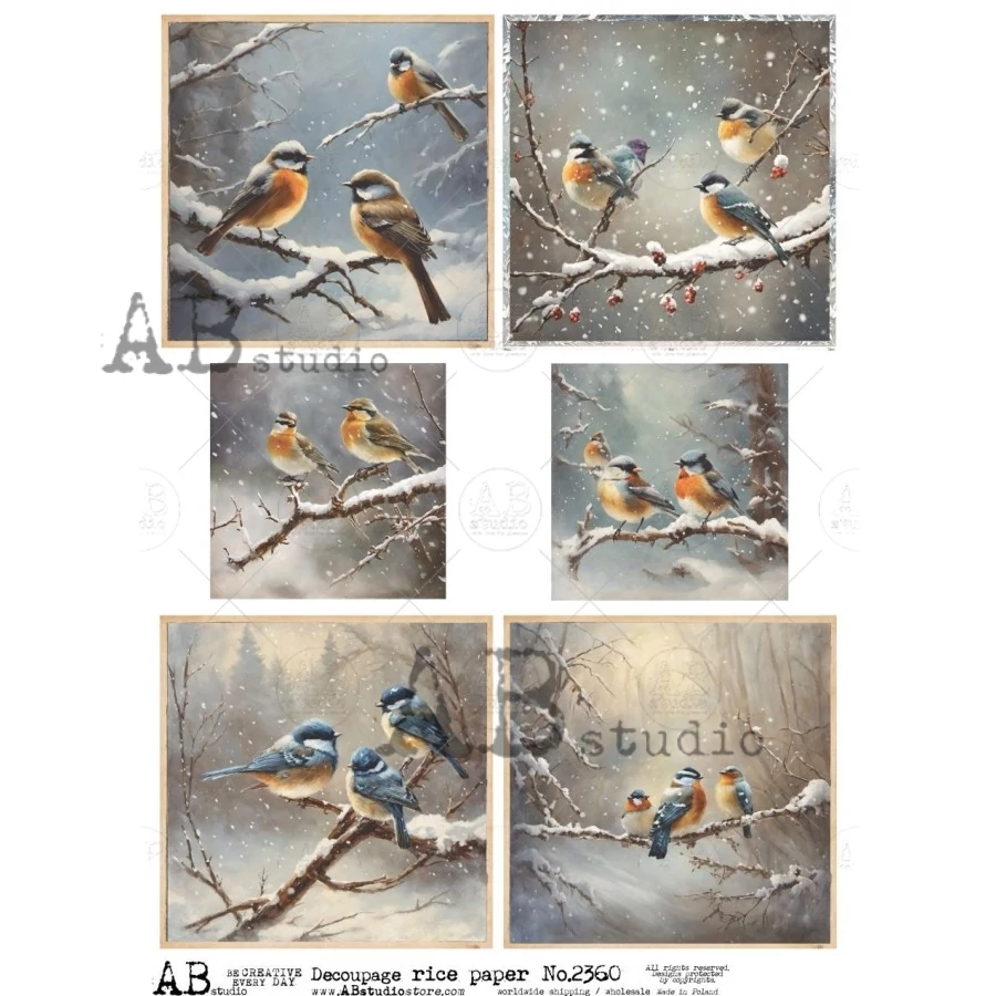 Rizspapir - cinkék és vörösbegyek havas ágon. A rizspapír egy könnyű, 30-35 gr-os papír, amely vékony szálakat tartalmaz. Bármilyen felületen használható dekupázs (decoupage) technikához a fától a vászonig, üvegig, fémig és akár textilre is! Tökéletes választás mixmédiás projektekhez. Ezeket a papírokat egész lapként vagy darabonként is használhatjuk.