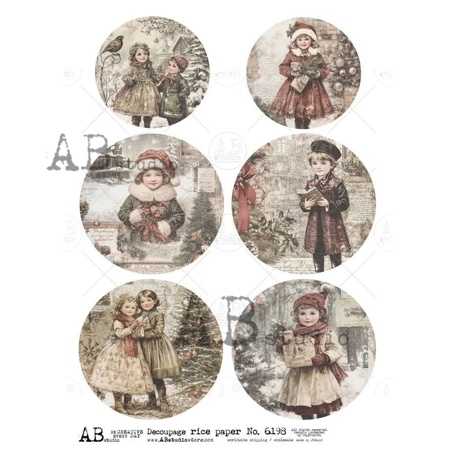 Rizspapir - gyerekek karácsonyfával, 6 kerek kép. A rizspapír egy könnyű, 30-35 gr-os papír, amely vékony szálakat tartalmaz. Bármilyen felületen használható dekupázs (decoupage) technikához a fától a vászonig, üvegig, fémig és akár textilre is! Tökéletes választás mixmédiás projektekhez. Ezeket a papírokat egész lapként vagy darabonként is használhatjuk.