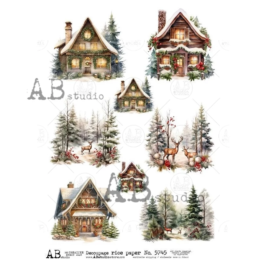 Rizspapir - havas házak, fenyők, őzek, 8 kép. A rizspapír egy könnyű, 30-35 gr-os papír, amely vékony szálakat tartalmaz. Bármilyen felületen használható dekupázs (decoupage) technikához a fától a vászonig, üvegig, fémig és akár textilre is! Tökéletes választás mixmédiás projektekhez. Ezeket a papírokat egész lapként vagy darabonként is használhatjuk.