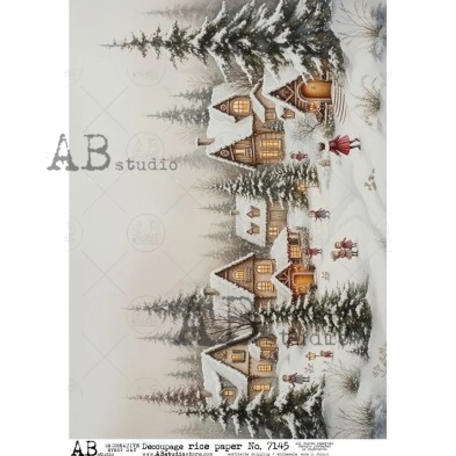 Rizspapir - havas táj házakkal, fenyőkkel. A rizspapír egy könnyű, 30-35 gr-os papír, amely vékony szálakat tartalmaz. Bármilyen felületen használható dekupázs (decoupage) technikához a fától a vászonig, üvegig, fémig és akár textilre is! Tökéletes választás mixmédiás projektekhez. Ezeket a papírokat egész lapként vagy darabonként is használhatjuk.