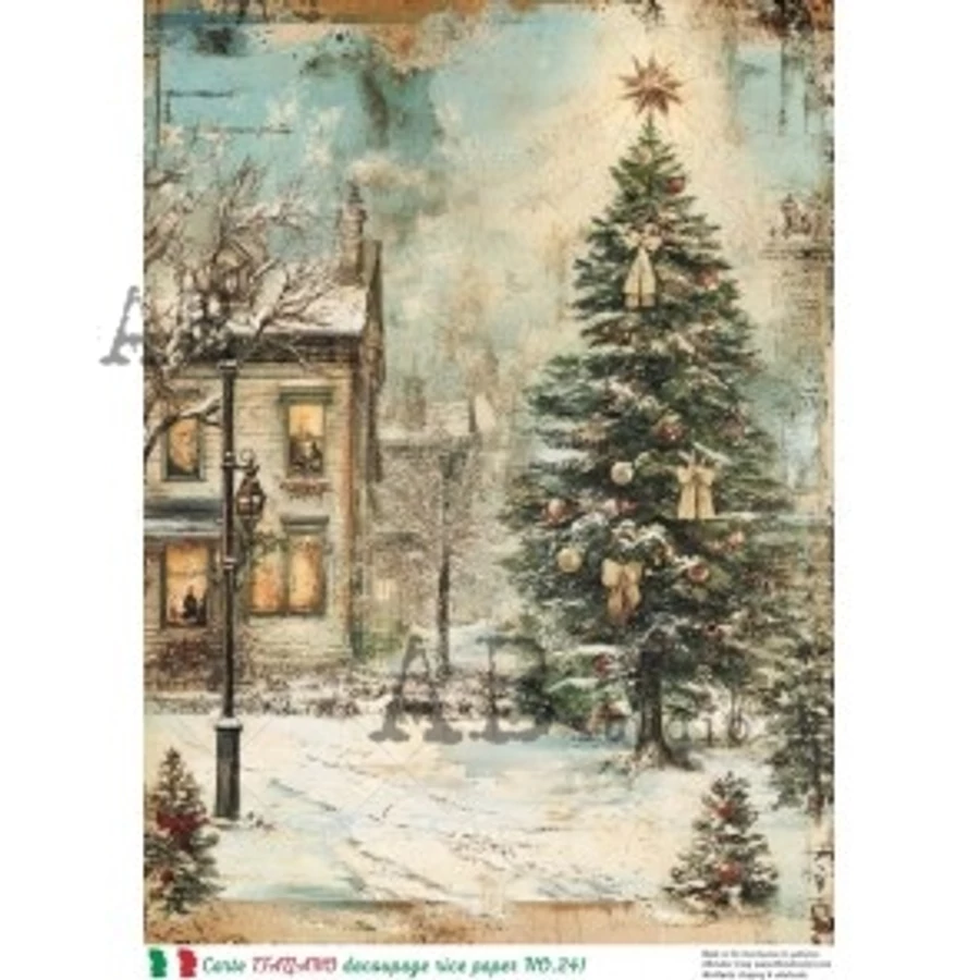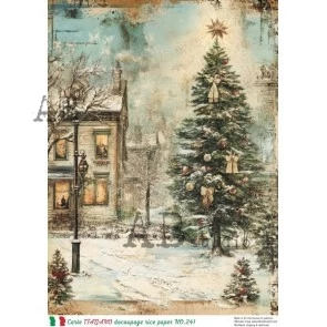 Rizspapir - havas utca fenyővel. A rizspapír egy könnyű, 30-35 gr-os papír, amely vékony szálakat tartalmaz. Bármilyen felületen használható dekupázs (decoupage) technikához a fától a vászonig, üvegig, fémig és akár textilre is! Tökéletes választás mixmédiás projektekhez. Ezeket a papírokat egész lapként vagy darabonként is használhatjuk.