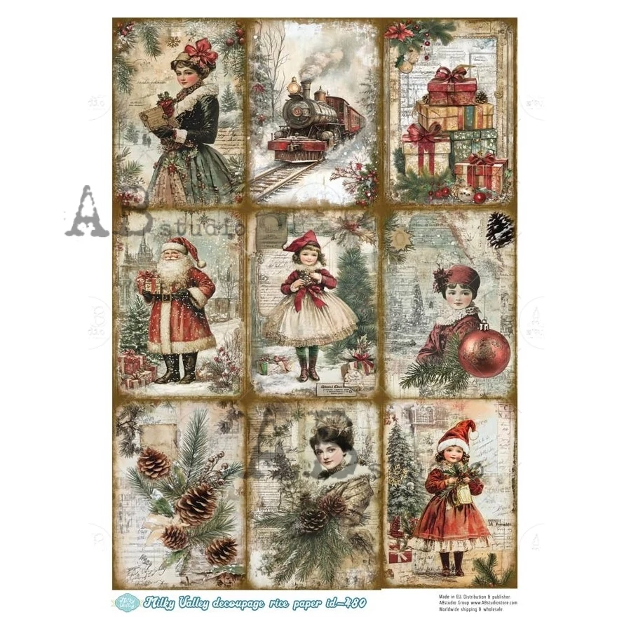 Rizspapir - téli képek, 9 kép. A rizspapír egy könnyű, 30-35 gr-os papír, amely vékony szálakat tartalmaz. Bármilyen felületen használható dekupázs (decoupage) technikához a fától a vászonig, üvegig, fémig és akár textilre is! Tökéletes választás mixmédiás projektekhez. Ezeket a papírokat egész lapként vagy darabonként is használhatjuk.