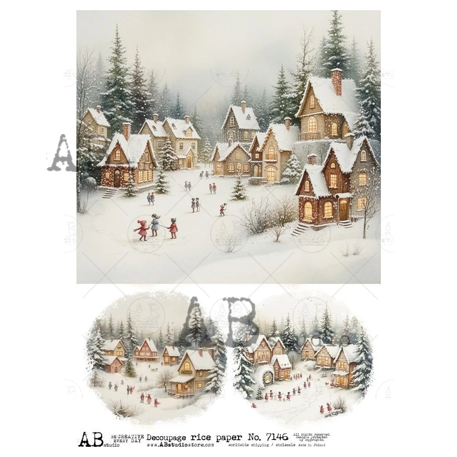 Rizspapir - téli táj házakkal, fenyőkkel. A rizspapír egy könnyű, 30-35 gr-os papír, amely vékony szálakat tartalmaz. Bármilyen felületen használható dekupázs (decoupage) technikához a fától a vászonig, üvegig, fémig és akár textilre is! Tökéletes választás mixmédiás projektekhez. Ezeket a papírokat egész lapként vagy darabonként is használhatjuk.