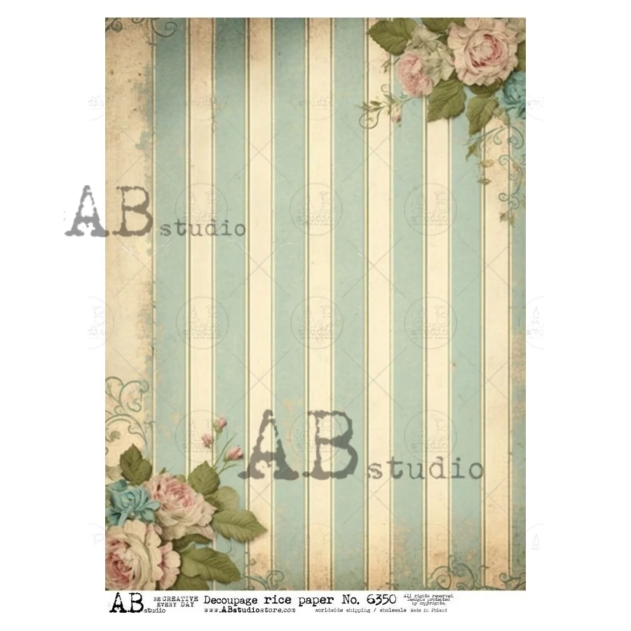 Rizspapir - vintage rózsák csikos háttéren. A rizspapír egy könnyű, 30-35 gr-os papír, amely vékony szálakat tartalmaz. Bármilyen felületen használható dekupázs (decoupage) technikához a fától a vászonig, üvegig, fémig és akár textilre is! Tökéletes választás mixmédiás projektekhez. Ezeket a papírokat egész lapként vagy darabonként is használhatjuk.