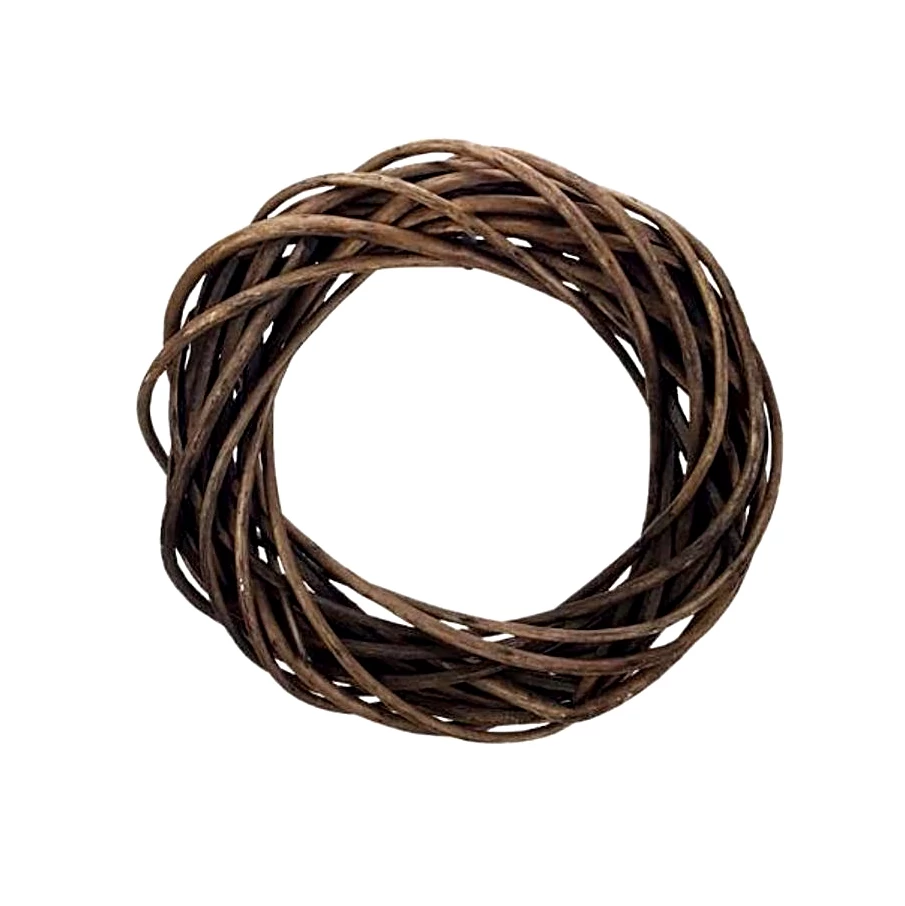 Vesszőből font barna koszorú, 15 cm átmérővel. Kitűnő alap ajtókopogtatóhoz, asztaldiszhez, asztali koszorúnak, karácsonyi dekorációs alapnak.